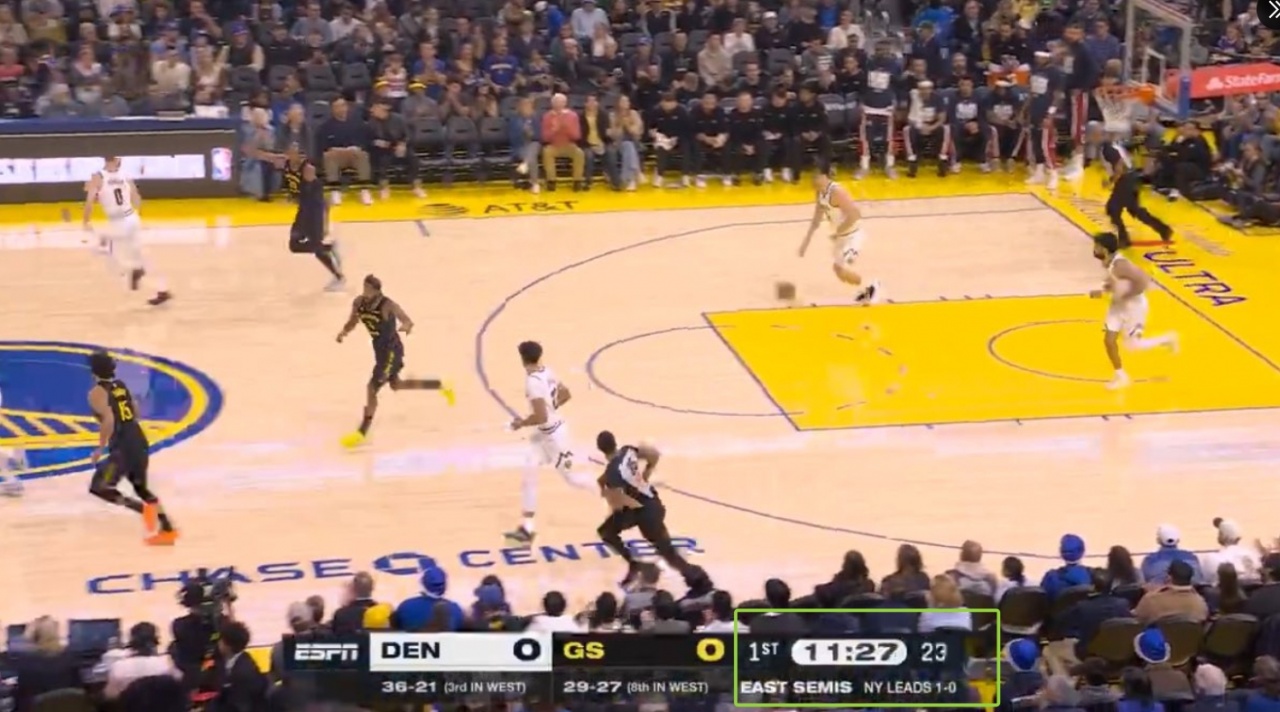 2月23日勇士vs掘金全美直播,字幕显示尼克斯东部半决赛1-0领先