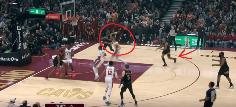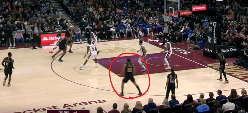 以更纯粹的形态作为空间点时,泰森也有很好的重新落位接应意识:施罗德持球突破走底线,泰森从上线向底角移动接应,利用坎宁安面对持球人的防守方式短暂抓住半空位出手机会: