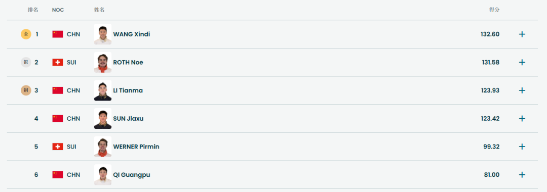 第二轮里,孙佳旭率先起跳,获得123.42分。随后李天马跳出123.93分,王心迪更是完美一跳拿到132.60分,三人一度占据前三名!可惜齐广璞失误,最终只获得81分。瑞士选手维尔纳同样失误仅获得99.32分。